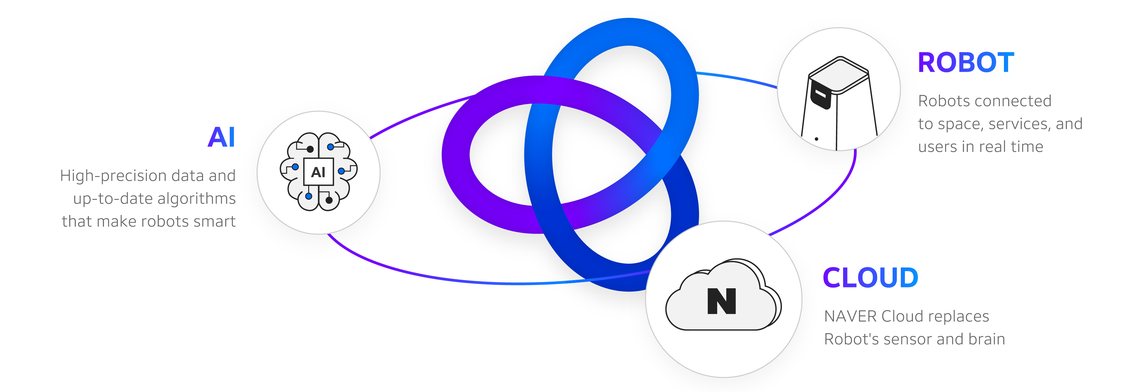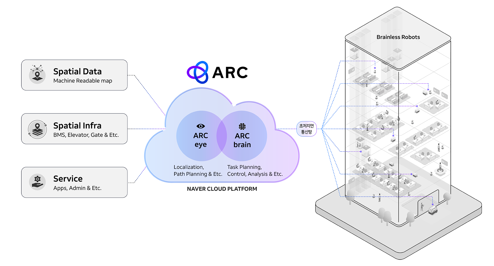 ARC, an acronym for “AI, Robot, Cloud,” contains advanced algorithms and high-precision data necessary for the coexistence between robots and humans. Many robots can simultaneously become smarter just by connecting with ARC through ultra-low latency networks. ARC, uploaded on the NAVER Cloud Platform, is able to show the robot’s exact position even indoors where GPS doesn’t work. It also takes on planning and processing for movement, localization, and task performance instead of the robot. Synced in real-time with spatial and service infrastructure, it understands and manages all online/offline environments between robots and humans.